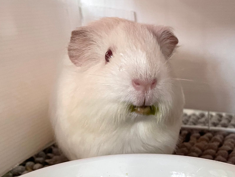 Fluffy will look up at you with her cute face if she smells food. She loves floor time and always asks to go out by nibbling the cage grids. She learned from Snowy where the good spots to chill are. When she goes back into her cage, you might find her popcorning because she’s happy she had floor time.